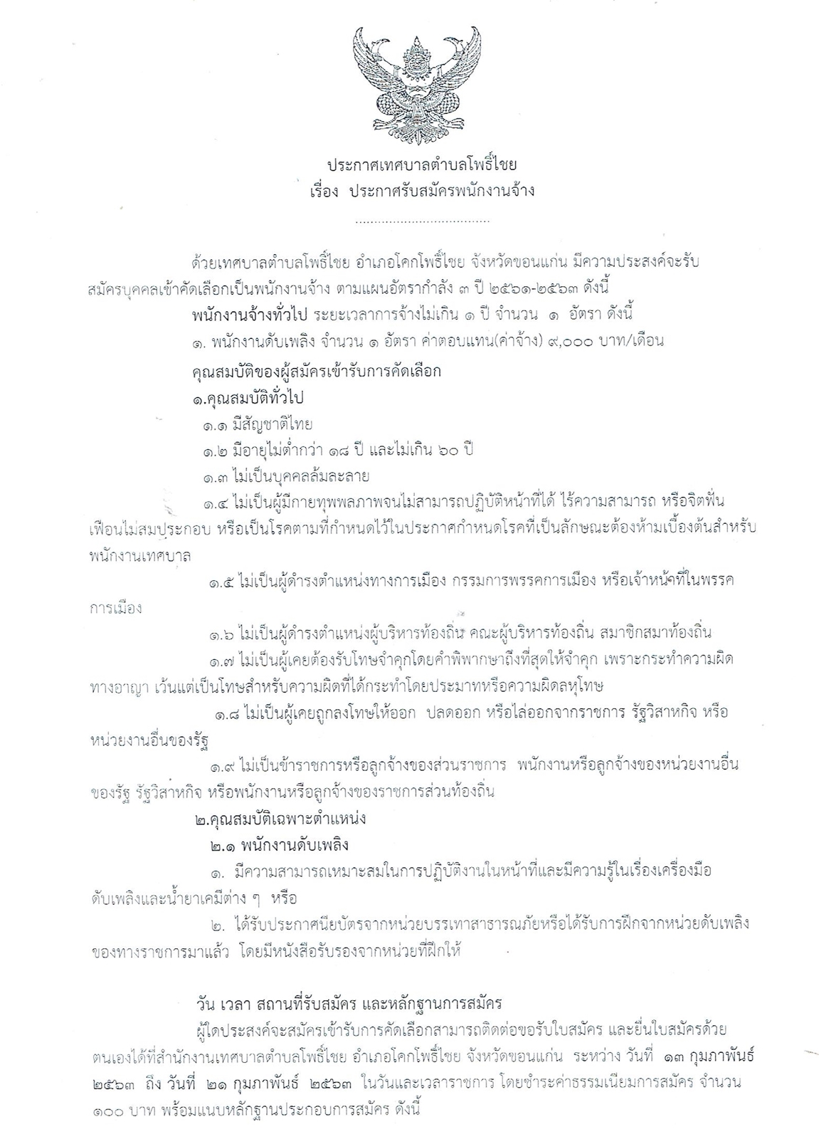 เทศบาลตำบลโพธิ์ไชย รับสมัครพนักงานจ้าง 1 ตำแหน่ง ระหว่างวันที่ 13-21 กุมภาพันธ์ 2563