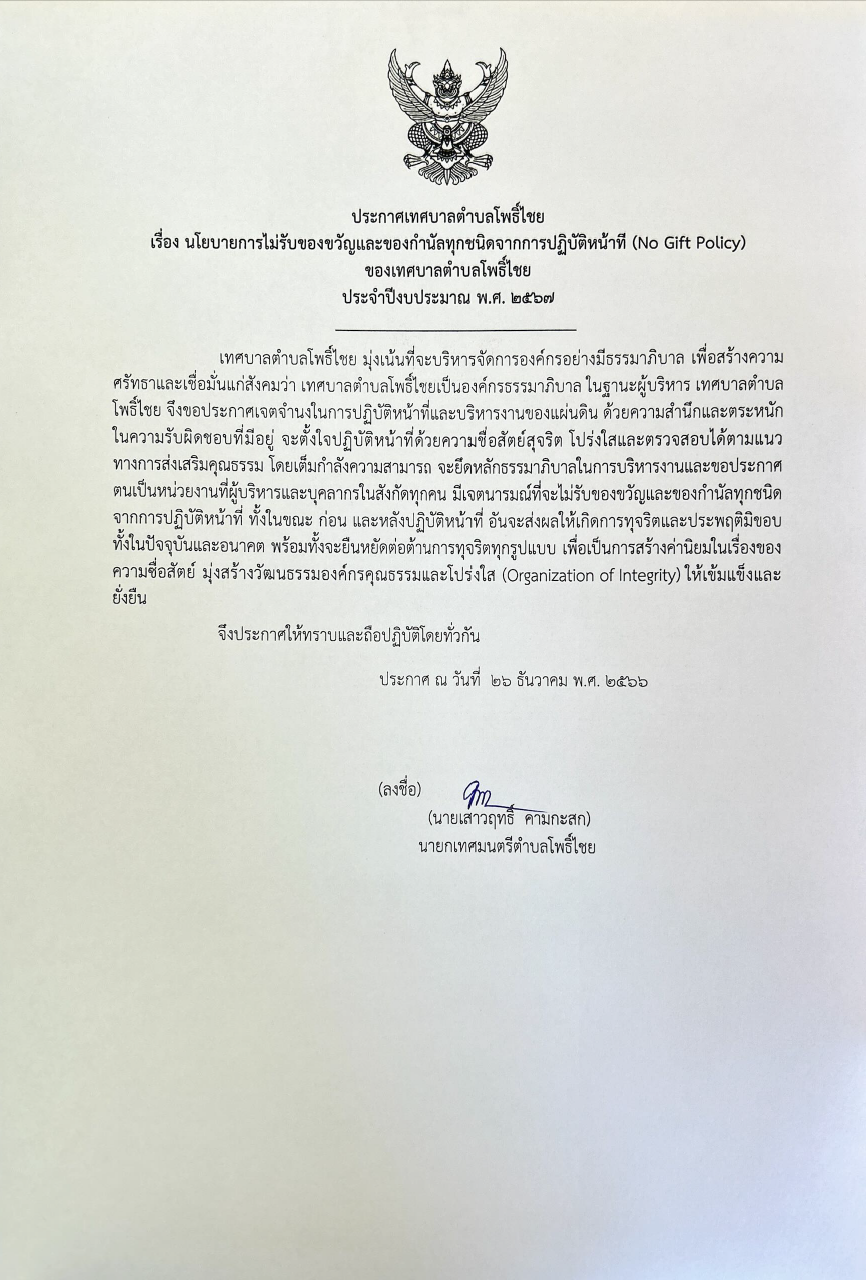 เรื่อง นโยบายการไม่รับของขวัญและของกำนัลทุกชนิดจากการปฏิบัติหน้าที (No Gift Policy) ของเทศบาลตำบลโพธิ์ไชย (ฉบับภาษาไทย)