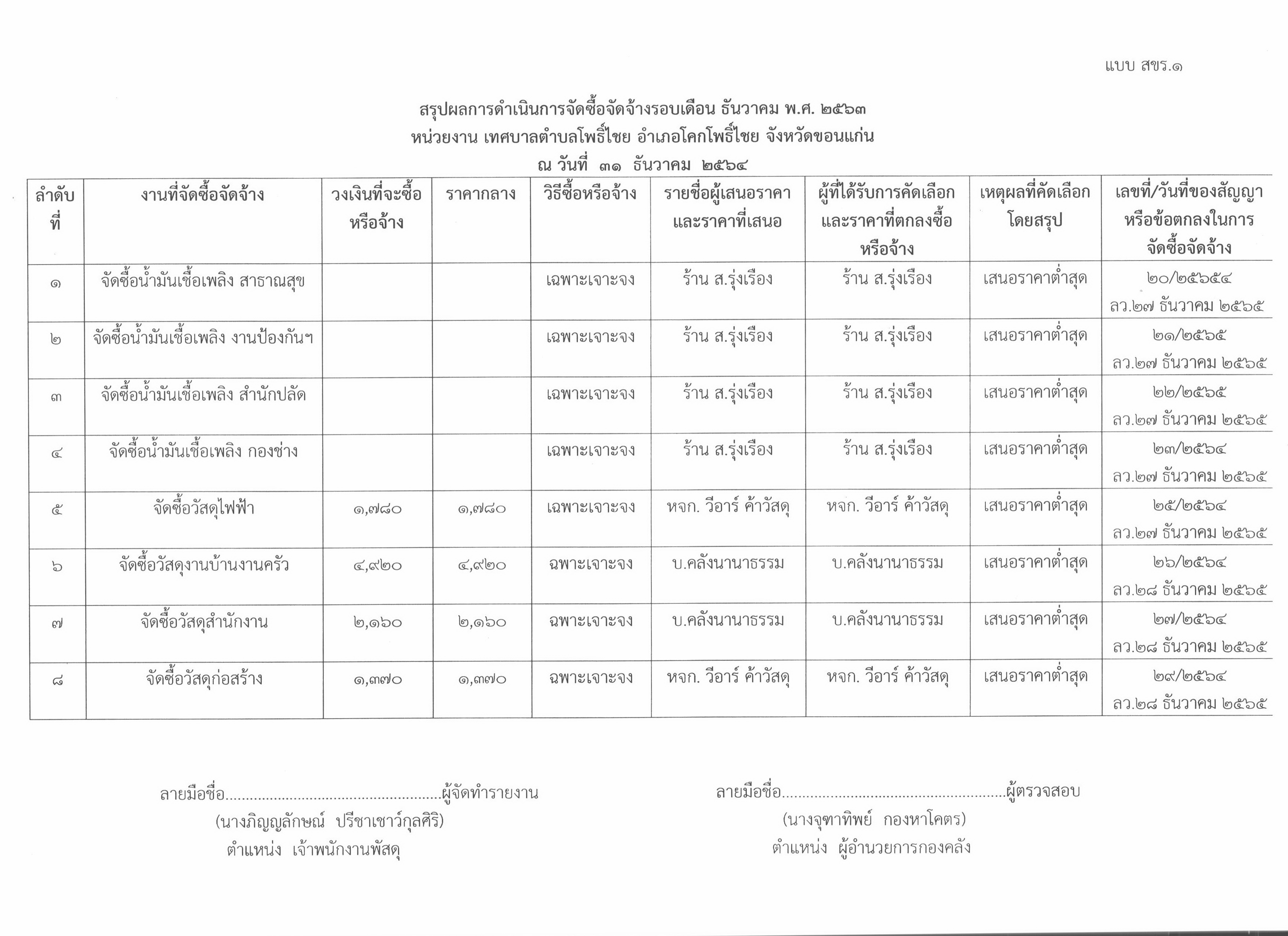 รายงานผลการจัดซื้อจัดจ้าง(สขร.) ประจำเดือน ธันวาคม 2564